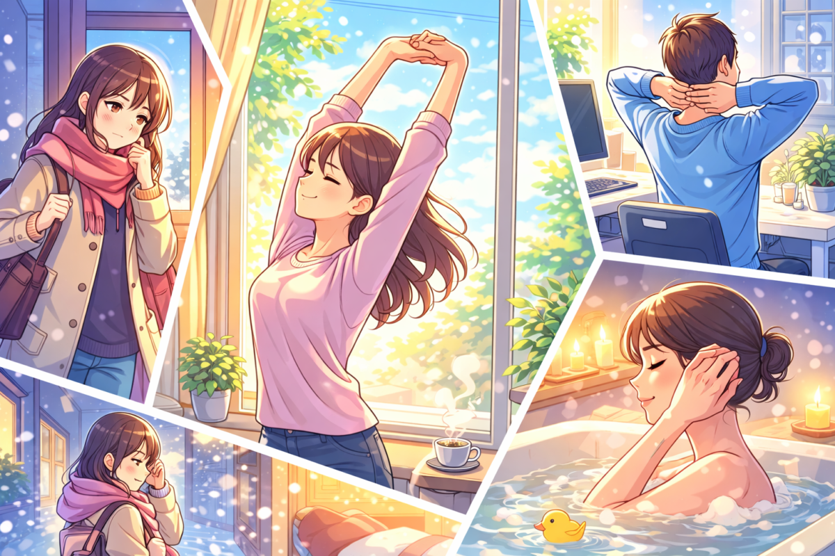 深呼吸や軽いストレッチで体をほぐし、自律神経を整えましょう。